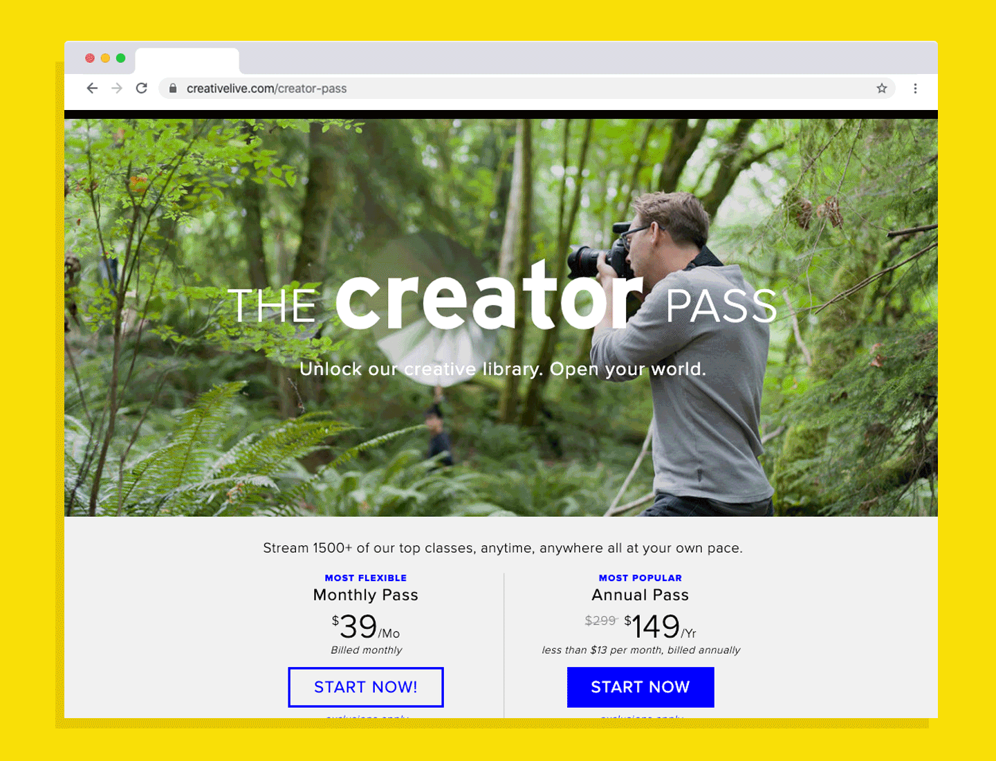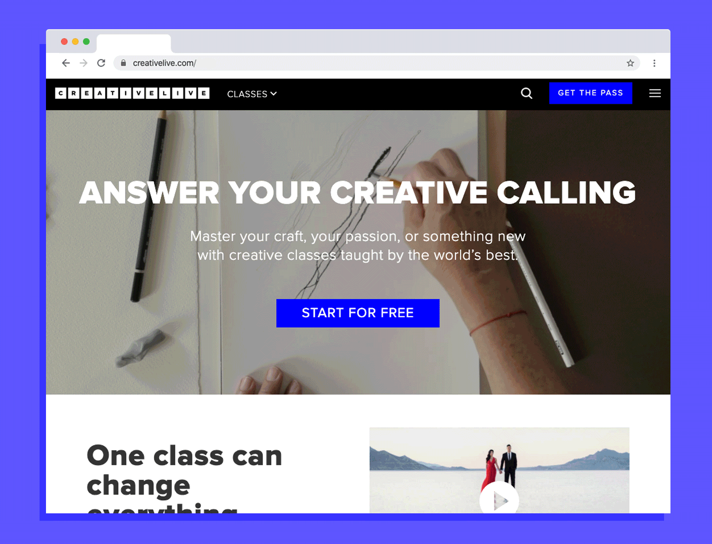 CreativeLive is a web platform providing online classes in photography, design, craft, business, and entrepreneurship. A refresh of the brand identity, along with a new voice + tone, resulted in needing a homepage design overhaul.